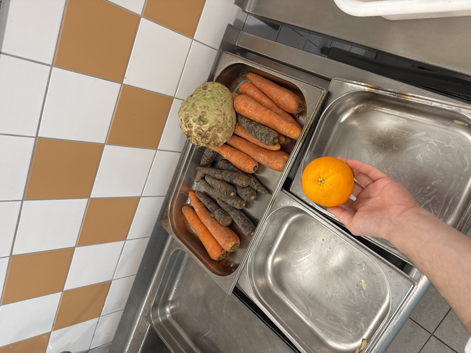 The scene, located in a food preparation area in Schiltigheim, France, captures a human left hand holding a single unpeeled orange, positioned above an empty stainless steel gastronorm pan