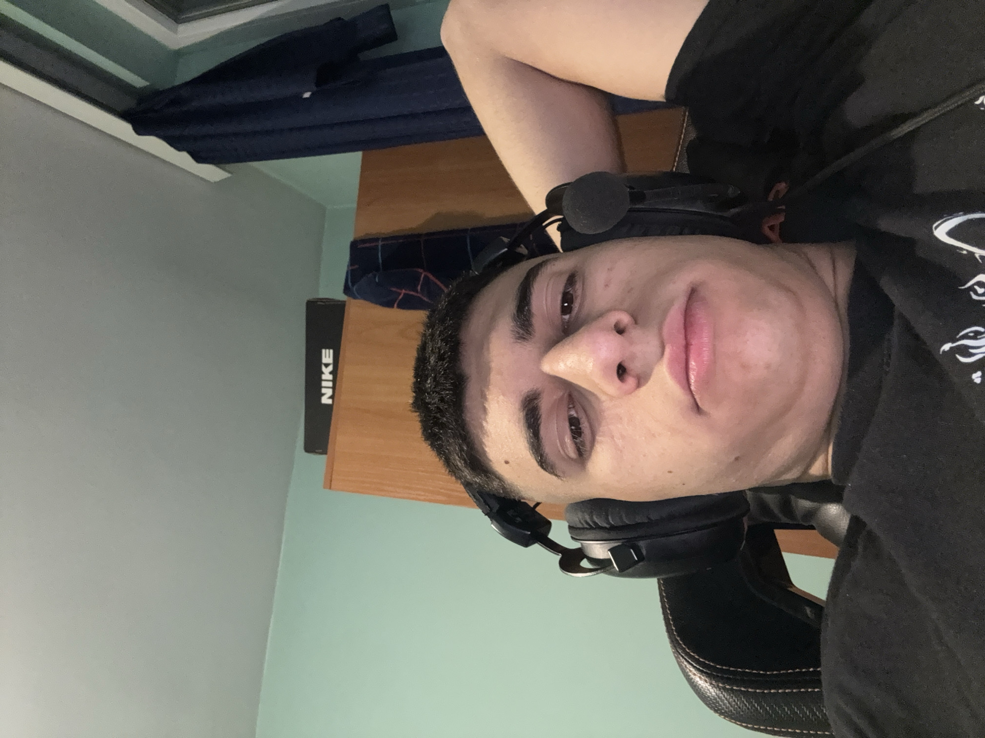 A young man is reclined back in a black gaming chair, wearing a black t-shirt and black headset. The headset has a microphone attached. He appears to be resting or looking at the camera. Behind him is a light blue wall and a wooden desk with a black Nike shoebox on it. A dark blue fabric is draped over the desk. A window and window frame are in the background.