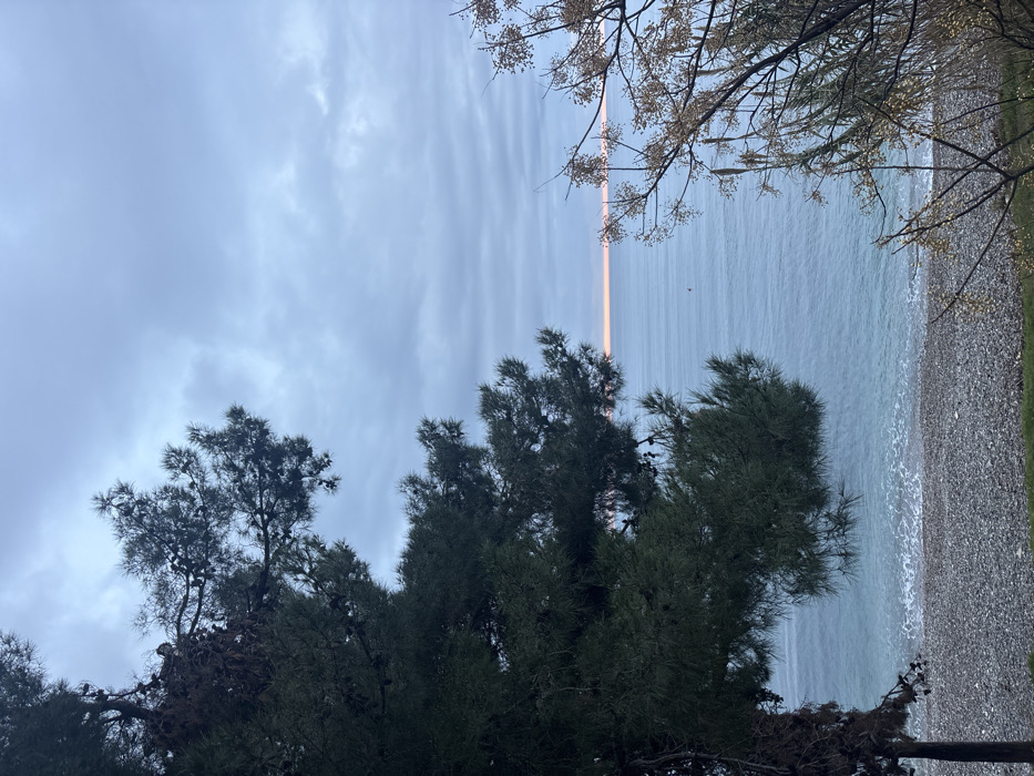 This image captures a coastal landscape in Bar, Montenegro, during twilight, likely dusk. The upper portion of the frame shows an overcast sky with light grey, stratiform clouds. A distinct, narrow horizontal band of faint orange-pink light marks the horizon line where the sky meets the sea. The body of water, appearing calm with minimal surface ripple, is a subdued blue-grey. In the mid-distance on the water, a small, reddish-orange buoy is visible. The immediate shoreline consists of a pebble beach, grey and brown in coloration, with shallow waves washing ashore. The left side of the foreground is dominated by the dense, dark green foliage of a coniferous tree, extending from the bottom to the top of the frame and featuring visible pine cones. The right side of the foreground presents sparser, lighter-toned tree branches, some with small, dry, yellowish clusters, and vertical stalks resembling reeds. No individuals, actions, or specific interactions are discernible within the scene.
