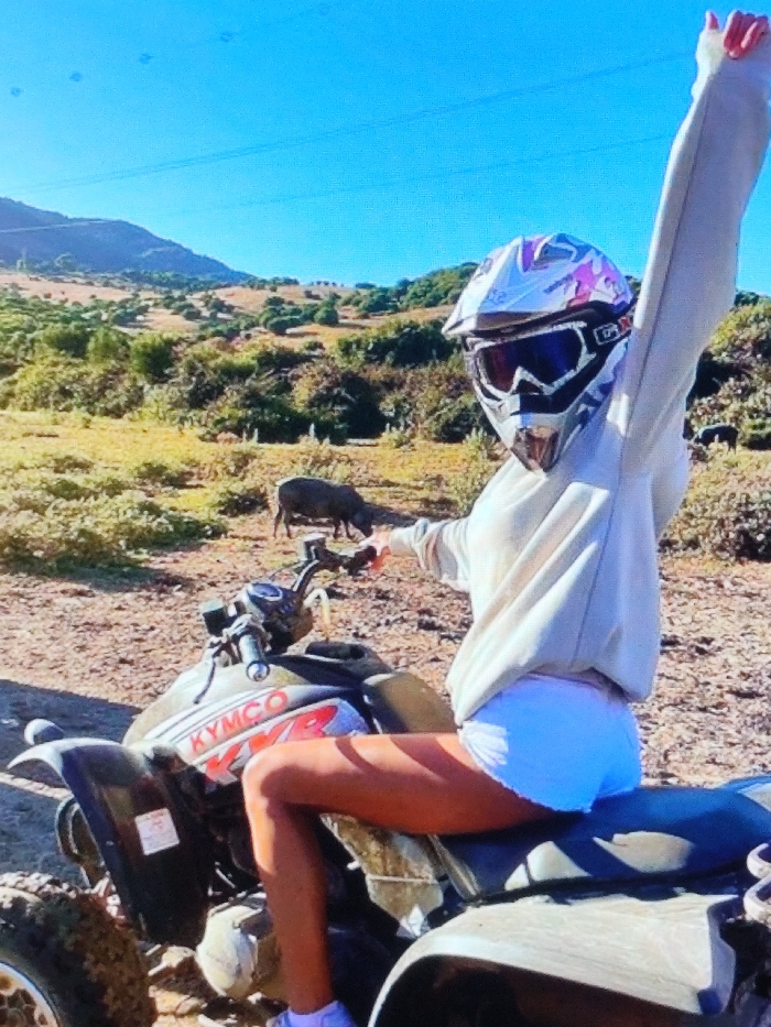 The location is the city of Sysmä, Finland. A person is seated on a dark-colored KYMCO KXR all-terrain vehicle (ATV) on a dirt track. The individual wears a white and purple motocross helmet with mirrored '100%' branded goggles, a light-colored long-sleeved sweatshirt, and white shorts. Their tanned right arm is raised high with a clenched fist, while their left hand is on the handlebars. In the background, an arid, sunlit landscape unfolds, characterized by dry, light brown ground, sparse green-brown bushes, and rolling hills under a clear blue sky. Two dark-furred animals, resembling wild boars, are visible foraging in the middle ground. Overhead power lines traverse the sky.