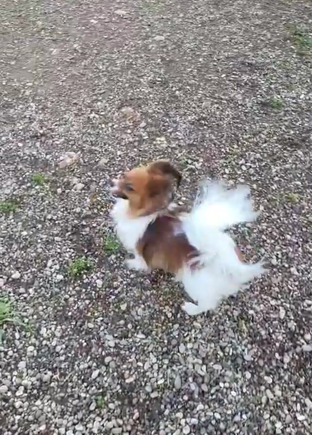 - "A small, brown and white Papillon dog stands on gravel and barks at the start of the video" by FM-ngoIJ3, licensed under CC BY 4.0