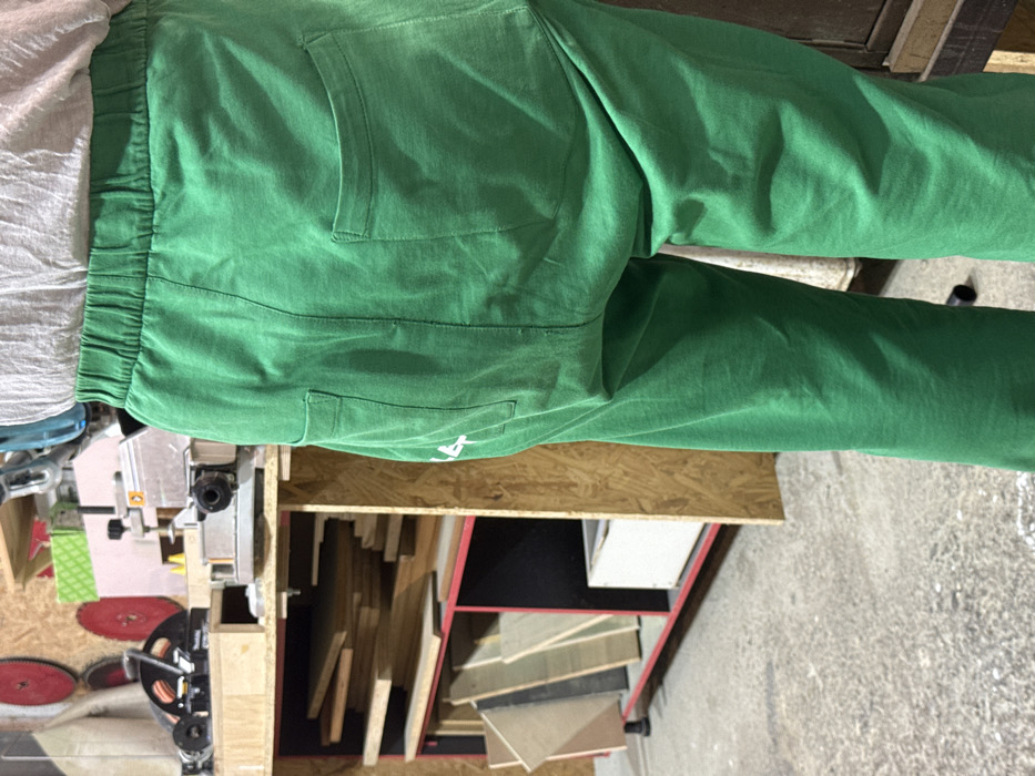 back of a person wearing green pants, standing in a workshop in Tel Aviv-Yafo, Israel, at the coordinates 32.058 latitude, 34.767 longitude. The person is wearing a white shirt and green pants with two back pockets. The pants are casual and appear to be made of a comfortable material. The person is standing in front of a wooden workbench with various tools, a white box, and a stack of wooden boards. The workbench appears to be in a workshop setting. The scene is lit by natural light, and the floor is concrete. The person's face is not visible.