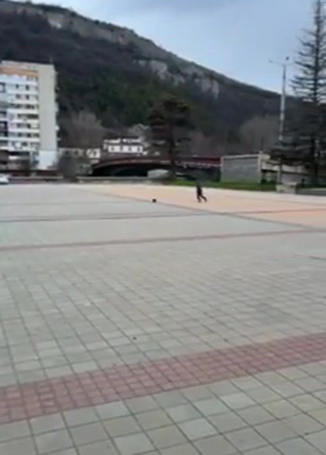 public square on an overcast day. The square is paved with light grey and red brick patterns. In the background, there's a mountain covered with trees and a tall apartment building. Initially, a person in dark clothing kicks a red ball across the square. The camera pans to the right, revealing a statue and a large white building with many windows. Towards the end, two people are seen walking with a stroller across the square. The environment appears somewhat urban with elements of nature.