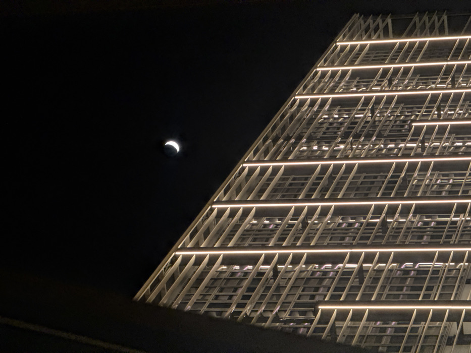 At night, a crescent moon hangs in a black sky next to a pyramid-shaped structure. The structure appears to be a modern architectural design featuring a grid-like pattern with horizontal illuminated lines. The dark foreground adds depth, contrasting the moon and the lighted structure. The scene is quiet and dramatic.