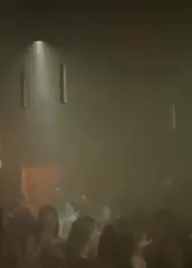 inside of a nightclub with a crowd of people in front of a sign that reads "Zazu". The lighting is dim, with a smoky or hazy effect. The club is crowded, with the silhouettes of people visible in the low light. A single spotlight beam shines over the crowd.
