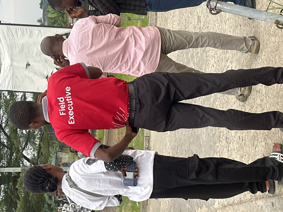 Three individuals stand closely together. The person in the foreground wears a white shirt, black pants with side pockets, and sandals. They hold a calculator-like device. Behind them, a person in a red shirt labeled "Field Executive" wears black pants and a belt. The third person wears a pink striped shirt and tan pants. They appear to be engaged in a phone call. A white tarp or banner is visible in the background, partially obscuring some trees. The setting appears to be outdoors, possibly a parking lot or paved area.
