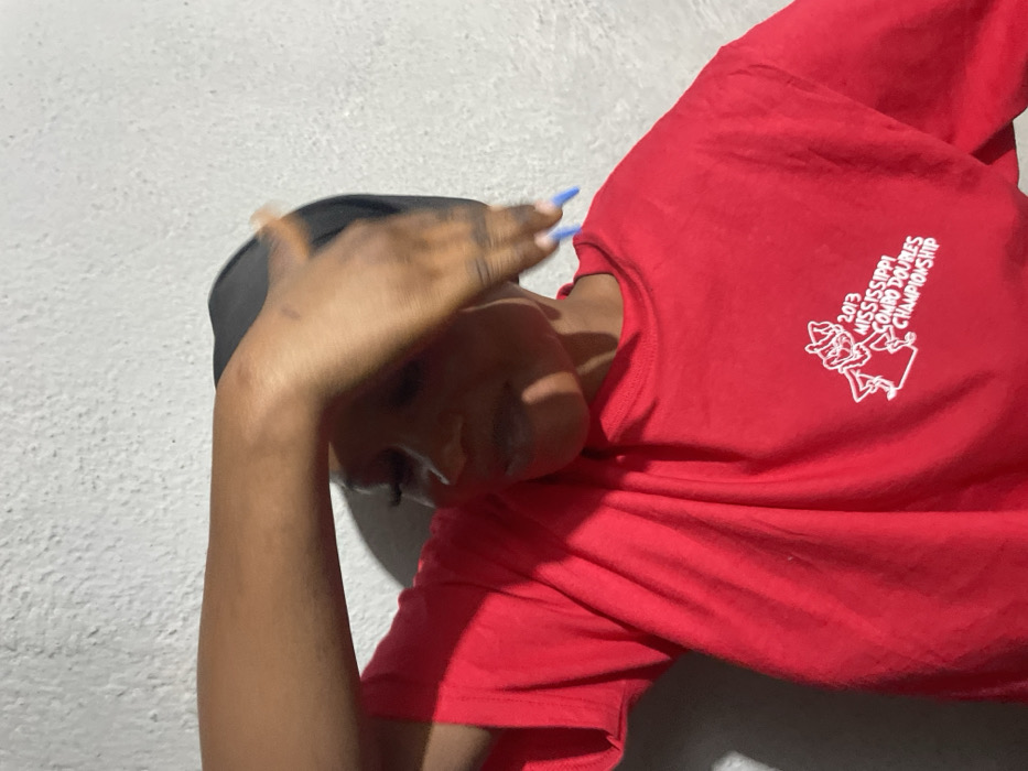 A person is angled to the side in a red T-shirt with white lettering and a cartoonish figure on the right chest area. The lettering includes "2013 Mississippi Combo Doubles Championship." Their head is tilted towards the right, and their left hand is near their head. They are wearing a black head covering. The background appears to be a white or light-colored textured wall. Their nails are long and painted a light blue color.