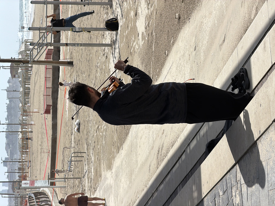 The image depicts an outdoor scene on a bright, possibly hazy day, featuring a wide sandy beach adjacent to a paved promenade. The provided location for this scene is the city of Amman, Jordan. In the foreground, a male individual, seen from behind, stands on a concrete step of the promenade, actively playing a light brown violin with a bow. He has short dark hair and a beard, and wears a dark grey long-sleeved shirt and black pants. His black sandals are off and positioned on a lower concrete step to his right. A red cord, possibly an earphone cable, hangs from his right side. Strong shadows from an unseen structure fall across the paved promenade and steps on the left. The midground shows the expansive sandy beach, where several people are engaged in activities. To the left, a shirtless man in dark shorts walks away from the viewer, heading towards the sandy expanse. In the central area, a child, dressed in white, is seen playing with a hula hoop. Further to the right, a man wearing a dark t-shirt and blue jeans is performing an exercise on a set of metal horizontal bars. A black backpack is placed on the sand near his feet. Various metal workout structures are scattered across the beach, along with red ropes or demarcation lines. Some white objects, possibly bags, are also visible on the sand. The background reveals multiple rows of covered beach umbrellas with striped canopies, leading towards a body of water with visible breaking waves, indicative of a sea or large lake. Beyond the water, a distant city skyline is present under a light blue sky, featuring various buildings including some with dome-like or pointed architectural elements.