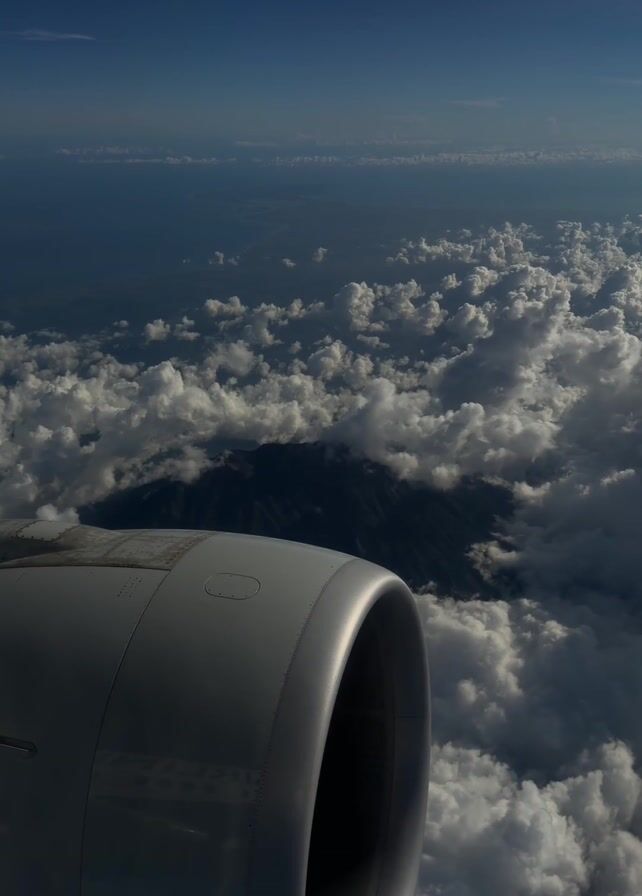 view from an airplane window during flight. Part of the airplane's engine is visible in the foreground, with fluffy white clouds filling much of the frame. Below the clouds, a dark, mountainous area is visible. The sky above is a clear, deep blue, with some hazy lighter areas further towards the horizon. The audio includes a voice, likely from an announcement system, thanking passengers.