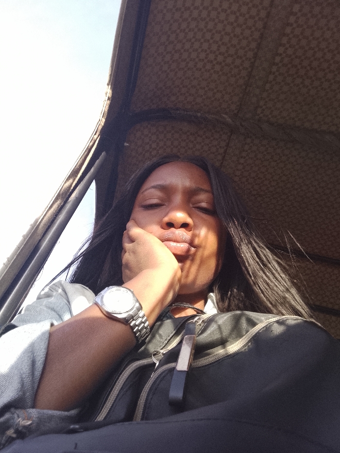 An individual with dark skin and long, straight, dark hair is depicted from a low angle inside a vehicle in Jos, Nigeria