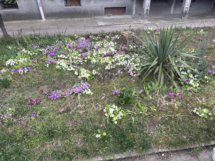 This image depicts a street-side garden in Sofia, Bulgaria, observed under daylight conditions. The foreground consists of a concrete curb. Beyond the curb, the garden plot features a mix of green grass, bare earth, and dried organic material. Numerous small flowering plants, primarily primroses, are scattered across the plot in clusters of white, purple, pink, and pale yellow. A large Yucca plant, characterized by long, spiky green leaves, is centrally located in the upper right portion of the garden. A tree stump is visible directly behind the Yucca. The background reveals a multi-story, utilitarian concrete building exhibiting a weathered appearance, with several windows and architectural details including a pink downspout and vertical concrete elements. A paved surface separates the garden from the building. No human or animal subjects are present in the scene.