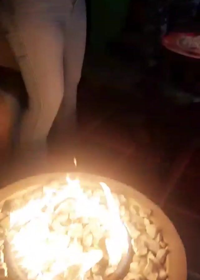 small group of women gathered around a fire pit at night. The fire pit is round and filled with small rocks, with flames rising from the center. The women are standing on a tiled patio. There is a red table with a plate of food, glasses, and other items. One woman is holding a piece of cheese, and another is laughing. A brick wall is visible in the background. The atmosphere appears relaxed and social.
