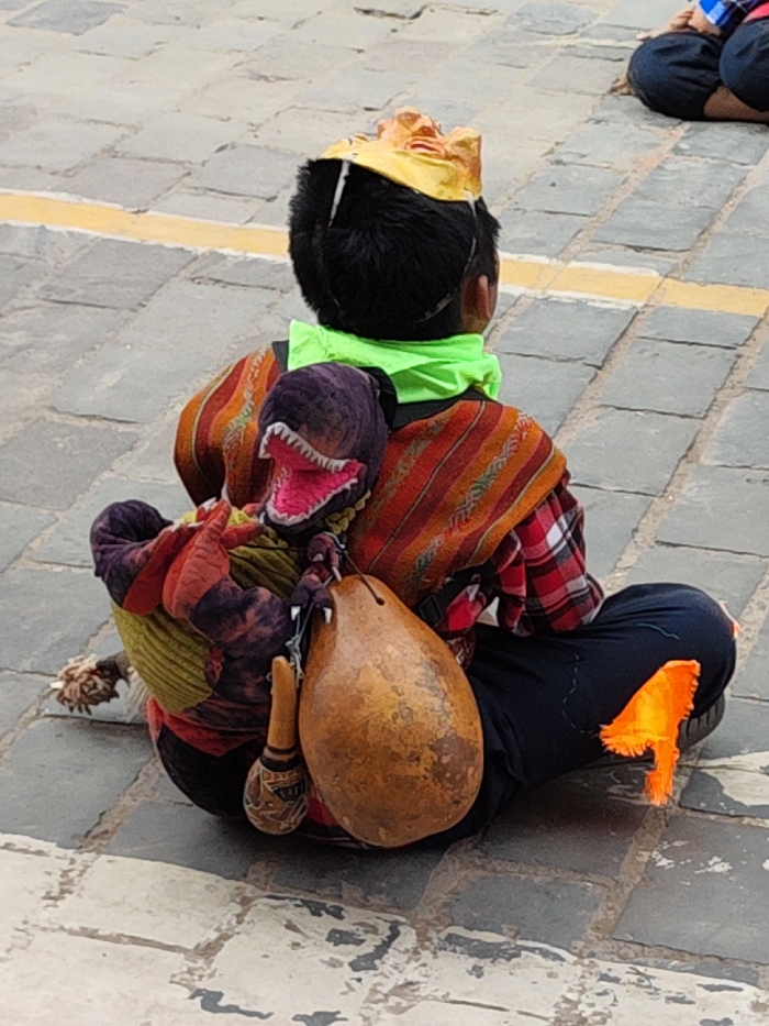 A child wearing traditional clothing and a gold crown sits on a cobblestone surface. A vibrant green neck wrap is visible. The child carries a plush dinosaur toy with an open mouth. Two gourds are attached to the dinosaur, one large and plain, and the other smaller with intricate designs. The child is wearing a red and orange striped shawl and a red plaid shirt. An orange tassel is on the child's leg. Another person is seated in the upper right corner.