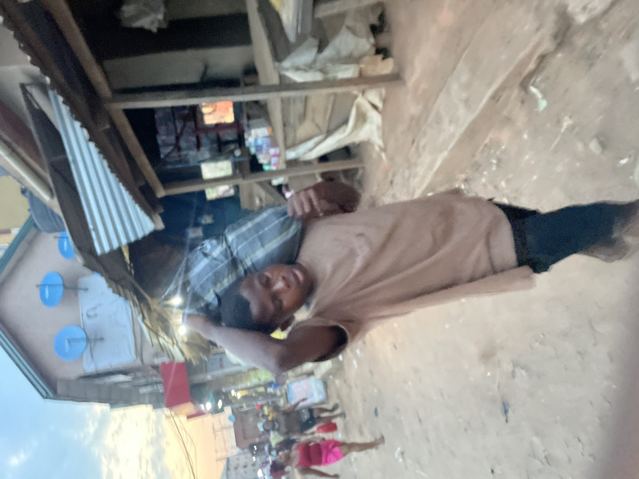 A person lies on their side outdoors. They wear a tan shirt and dark pants. A gray plaid shirt is underneath their head. The setting seems to be a busy street, with people walking in the background. A building with blue satellite dishes is visible, along with makeshift shelters and shops lining the street. The ground is uneven and dusty.