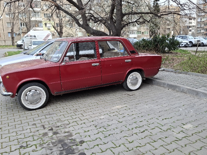 The scene depicts an urban parking area in Stara Zagora, Bulgaria, under daylight conditions. The primary subject is a four-door, dark red sedan, resembling a Lada VAZ-2101 model, parked on a grey interlocking paver surface. This vehicle features chrome bumpers, chrome door handles, and white-rimmed tires with chrome hubcaps. Its front left section is positioned adjacent to a silver sedan, which is largely obscured. The red car's rear right tire is partially elevated on a concrete curb, adjacent to a dirt patch with sparse green vegetation. The ground consists of grey concrete pavers, exhibiting some dark stains and grass growth in the interstices. A grey concrete curb delineates the paved area from a strip of unkempt grass and small bushes. In the background, multiple multi-story residential buildings with light-colored facades are visible, featuring balconies and external air conditioning units. A large deciduous tree with bare branches dominates the upper-middle ground, with other smaller trees and shrubs scattered throughout. Additional vehicles, including a white service van with red checkered markings and several other sedans and an SUV, are parked further in the background. No individuals are present in the image.