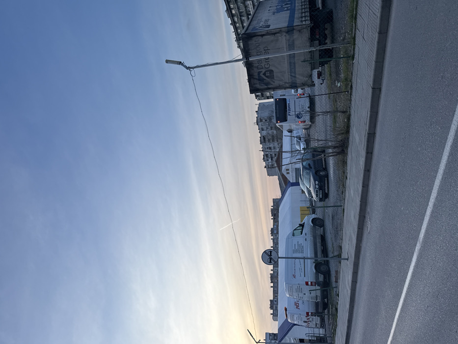 The image presents a static, ground-level view of a commercial or industrial roadside area within Dimitrovgrad, Bulgaria. In the immediate foreground, an asphalt road with a single white lane marker is visible, bordered by a concrete sidewalk. Behind the sidewalk, a chain-link fence encloses a gravel lot. Within this lot, a large, white, tent-like structure occupies the left side. Multiple vehicles are parked within the fenced area: three white Mercedes-Benz Sprinter vans, each displaying "ПРОФИЛ МАГАЗИ" and an "NS" logo in Cyrillic script, are aligned facing right. To their right, a dark-colored sedan is parked, followed by the rear of a white bus marked with "РУДИН" in Cyrillic. On the far right, a large white semi-trailer truck (lorry) with "Dargoot Groep" and a house logo on its canvas side is positioned. A faded circular road sign, likely indicating the "End of No Overtaking," stands centrally in the lot. A utility pole with a small light fixture and an overhead wire is visible on the right side, extending across the upper midground. In the background, beyond the commercial lot, several multi-story residential apartment buildings of a utilitarian architectural style line the horizon. The sky above features scattered, wispy clouds with a warm, golden hue near the horizon, transitioning to a pale blue overhead, indicative of either sunrise or sunset. A distinct aircraft contrail is visible traversing the upper portion of the sky. No individuals are present in the scene, and all vehicles appear parked and unattended. Sparse, bare vegetation is scattered behind the fence.