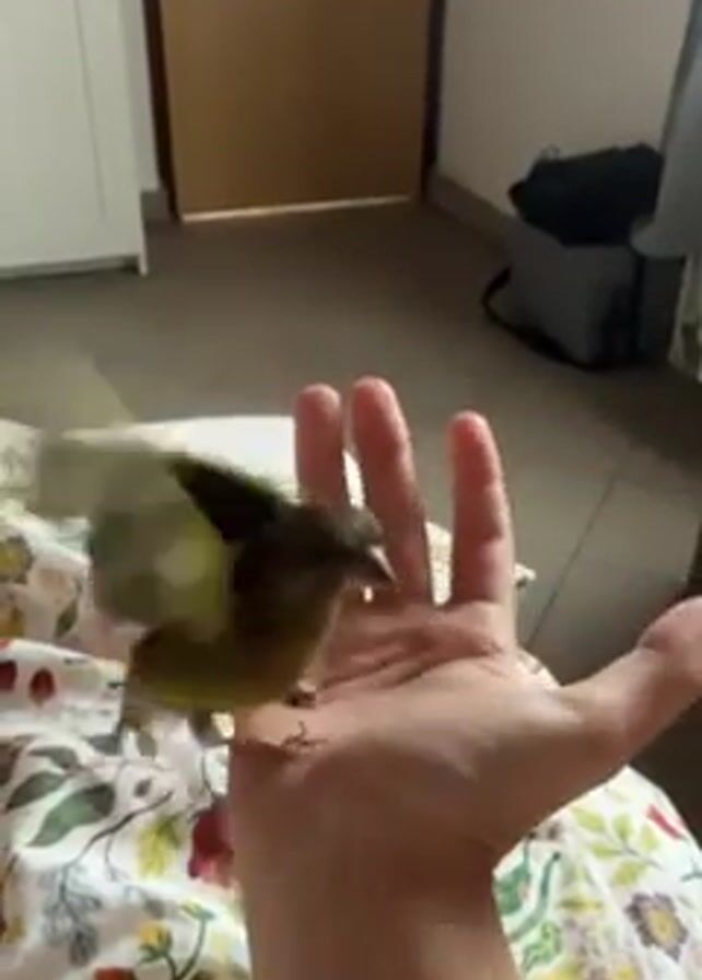 A person is sitting on a bed with a colorful floral patterned comforter. They are holding a small bird with green and yellow feathers in their open hand. The bird turns and then flies away from the person's hand. The camera follows the bird as it flies across the room. The room has beige walls, a white wardrobe, and a light brown door. There is also a dark bag on the floor.