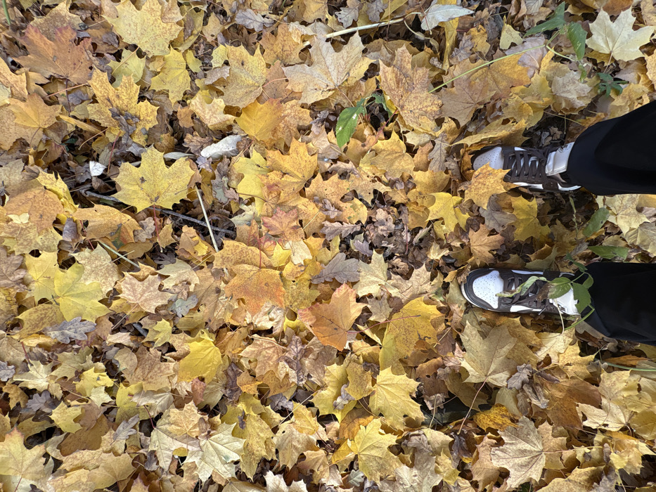 A high-angle view captures an individual's lower legs and feet positioned on a ground surface entirely covered by a dense layer of fallen autumn leaves