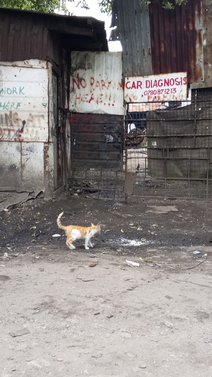 The image depicts an outdoor scene within a makeshift commercial area or informal settlement in Nairobi, Kenya. In the foreground, an orange and white domestic cat is captured mid-stride, moving right across a dusty, unpaved ground scattered with small debris and a dark, possibly damp or oily patch. Directly behind the cat, a collection of structures built from corrugated metal sheets, both rusted and painted white, forms the backdrop. On the left, a white painted section shows partially legible green graffiti, including the words "WORK HERE." To its right, a white sign board reads "NO PARKING HERE!!!" in red paint. Further to the right, a dark, rusted metal gate, composed of horizontal and vertical bars, stands partially open, revealing a dark and cluttered interior. Attached to the gate or an adjacent structure is a white signboard displaying "CAR DIAGNOSIS" in red, with the Kenyan mobile number "0780871213" below it. The upper background features green foliage against an overcast sky. No human subjects are present.