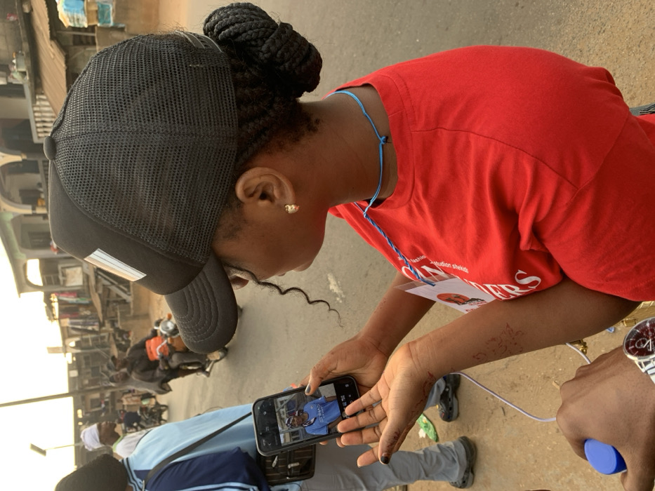 A person wearing a black cap and red t-shirt looks down at a phone. The phone's screen displays a photo of a person in a blue sports jersey. The person's arm has temporary henna tattoos. A blue lanyard hangs around the neck. Buildings, people on motorcycles, and other figures appear blurred in the background. The individual is outdoors on what appears to be a street or pedestrian area. Another individual is partially visible on the right side of the frame.