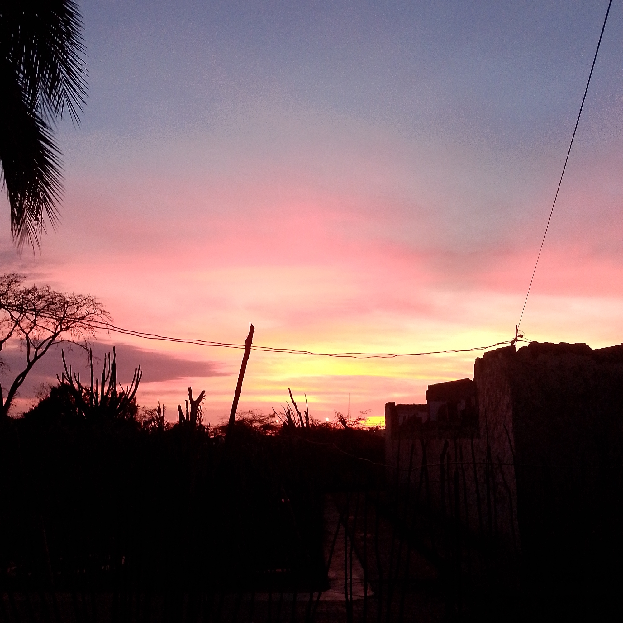 The image depicts a sunset in Altagracia, Venezuela. The sky transitions from pink near the horizon to blue overhead. Silhouetted vegetation, including cacti and a tree, occupies the foreground. A building is visible in silhouette on the right, with power lines running across the sky. A portion of a palm tree appears in the upper left corner.