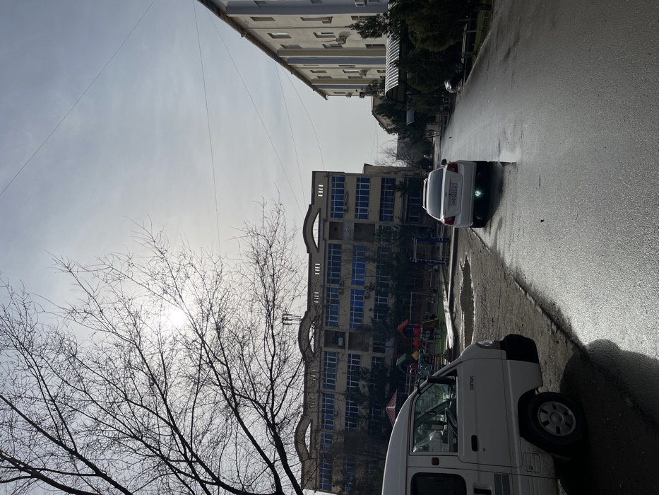 A street scene featuring buildings, parked cars, and a bare tree. A white van and a white sedan are parked on the right side of the street, which appears wet. A playground is visible between the buildings. The sky is overcast and gray. Electrical lines are visible stretching between buildings. The sun is partially obscured by the tree branches.