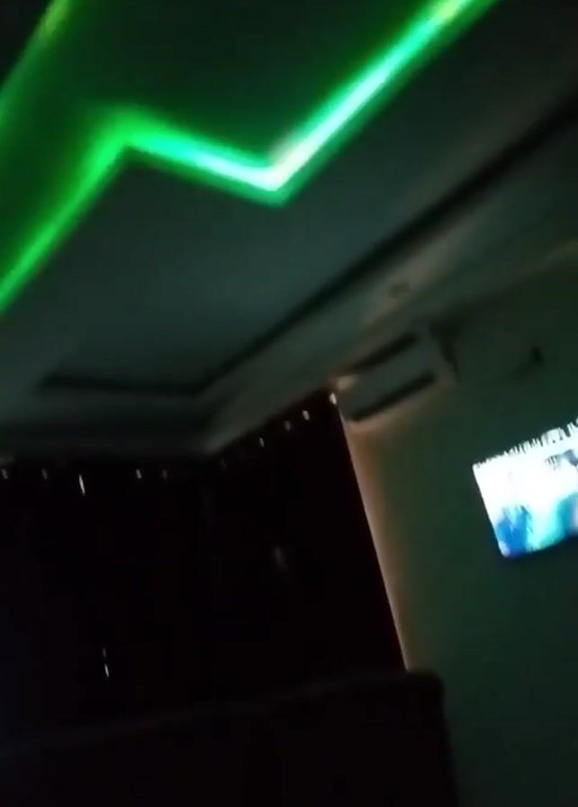 The camera pans across a dimly lit room with a low ceiling featuring geometric recessed lighting. The light color cycles between green and red. A television is mounted on the wall, showing people on screen. There are dark furniture pieces, possibly chairs or sofas, in the foreground. An air conditioning unit is also visible. The overall atmosphere seems casual.