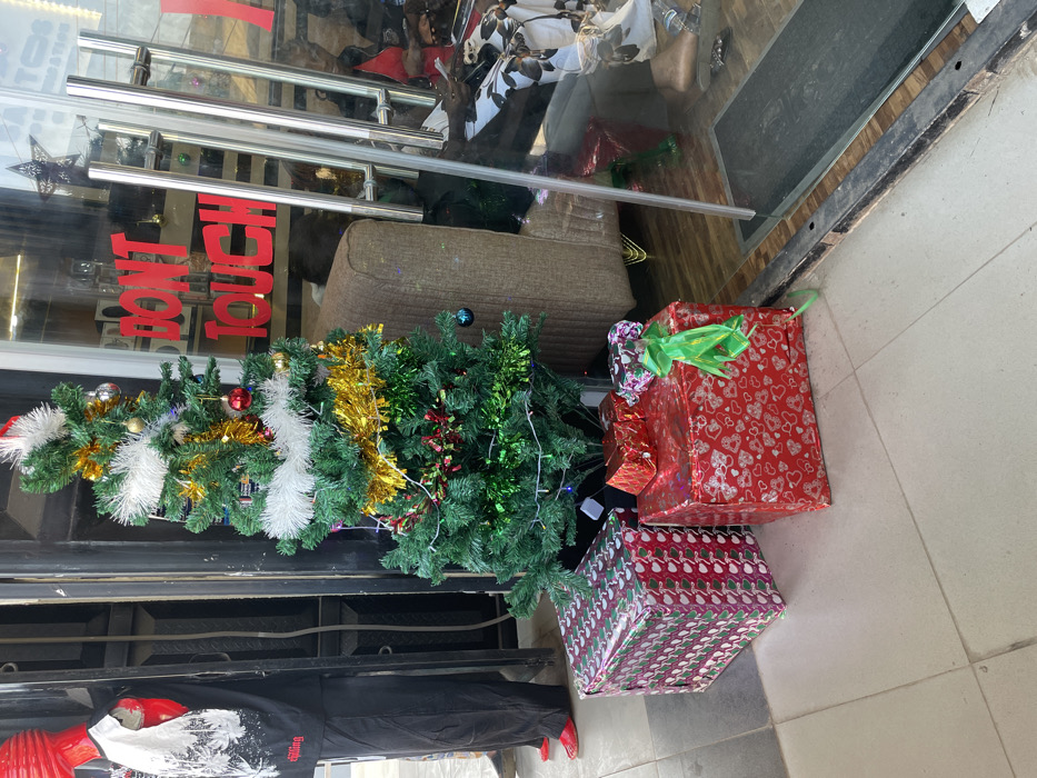 This image depicts a Christmas display at the entrance of a commercial establishment in Jos, Nigeria