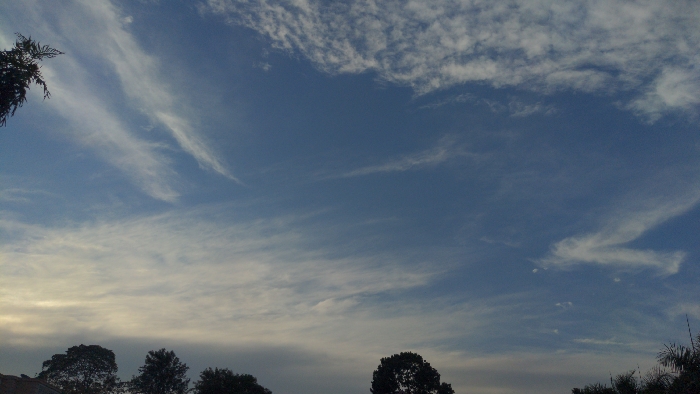 A daytime sky exhibits cirrus clouds with wispy, brushstroke-like shapes scattered throughout