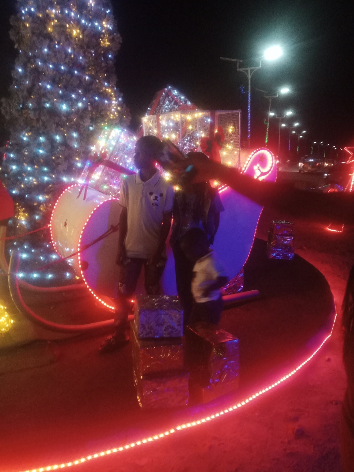 Two children stand near a Christmas tree and sleigh decoration at night. The tree is adorned with white lights, and the sleigh is illuminated with red and blue lights. Gift boxes with shiny wrapping paper sit at the base. Streetlights line the background, creating a festive and colorful ambiance. A dark arm extends into the frame, partially obscuring the view.