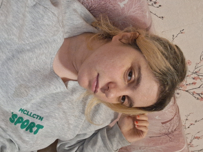 A female individual, estimated 20-40 years of age, is depicted in an indoor setting. She has light skin, dark eyes, and multi-toned blonde hair with darker roots. She wears a light grey crewneck sweatshirt featuring the green text "MCLLCTN SPORT" on the right chest area. Her left hand, with red nail polish on the fingernails, is positioned near her head. The individual gazes directly at the camera with a neutral expression. The background consists of a patterned surface, consistent with wallpaper or fabric, displaying light pink branches with small floral or leaf elements on a light beige ground. The specific location within the city of Lanchkhuti, Georgia, is not discernible from the visual evidence presented in the image.