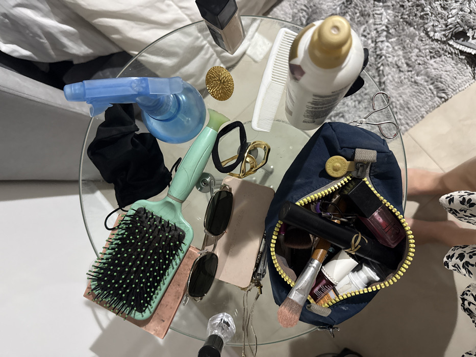 The scene is located in Santa Clara Ocoyucan, Mexico, and depicts a round glass-top table cluttered with various personal grooming and cosmetic items. The table is situated over a light-colored tiled floor, with a gray textured rug partially visible on the right. In the background, sections of a bed with white and gray bedding are discernible, along with a wall. On the glass table, a mint green paddle brush with black bristles tipped in green rests atop a light pink rectangular object, possibly a cosmetic palette. Nearby, a crumpled black fabric item, resembling a scrunchie, is present. A small, translucent blue plastic spray bottle with a trigger nozzle stands next to it. Further right, a dark bottle with a black cap, consistent with liquid foundation, is partially visible, alongside a small, round, textured gold-colored decorative item. A white plastic comb is positioned next to a white cylindrical bottle with a gold-colored pump dispenser, oriented horizontally. Small, silver-colored metal eyelash curlers are visible. A dark blue rectangular cosmetic bag with a bright yellow zipper is open, revealing multiple cosmetic items, including various makeup brushes, lipstick tubes, and other containers. A cream-colored Kipling monkey keychain is attached to the zipper pull of this bag. To the left of the cosmetic bag, a pair of black oval-framed sunglasses with dark lenses rests on another light pink rectangular object. A small, clear glass bottle with a black cap, a black elastic hair tie, a gold-colored irregularly shaped metal object (possibly an earring or hair clip), and a thin, silver-colored metal chain (likely a necklace) are also distributed across the table surface. Directly beneath the table, two bare human feet are positioned on the tiled floor, suggesting a person is standing over the table. The lower portion of two legs is also visible, along with the front section of a pair of shoes featuring a black and white floral or abstract pattern, visible on the far left of the frame.