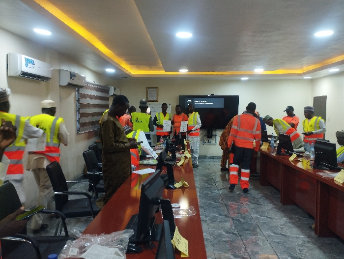 conference room in Ashaka, Nigeria, located at the coordinates 10.929 latitude and 11.476 longitude. The room is well-lit with a white ceiling and beige walls. There are several people in the room, all wearing orange vests and some also wearing white hard hats. The room is organized with long tables covered in brown wood, and the room features several black computers with screens facing the tables. A woman in a colorful dress stands in the background near a large black TV mounted on the wall. The people are in various stages of interacting with the computers. Some appear to be examining the screens, others appear to be speaking with each other. Some people are standing while others are seated in black chairs. The overall impression is that of a work meeting or training session. There are several yellow sticky notes on the tables. There are two air conditioners in the room. The windows have blinds. The floor is made of gray tile. The image suggests the room is being used for a work-related activity.