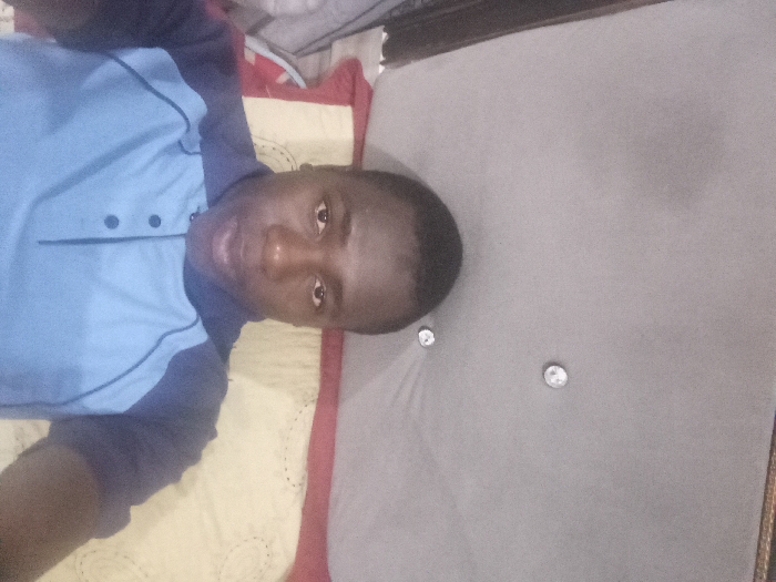 The image depicts a young adult male in an indoor setting within the city of Afaka, Nigeria