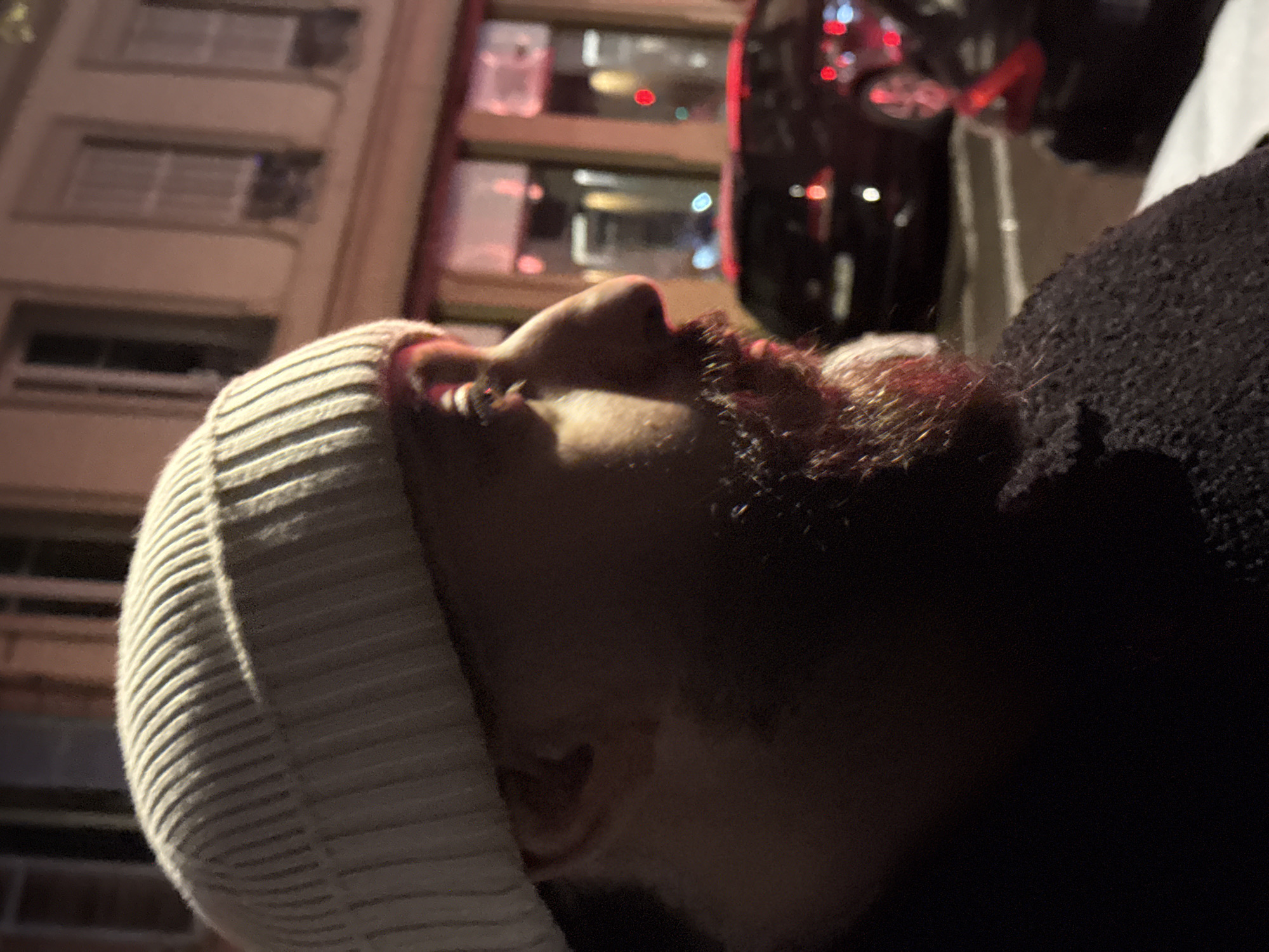 close-up, low-angle shot of a person wearing a ribbed white beanie, looking upward. The person has a beard with reddish tint. In the background, out of focus, are building windows and car lights, suggesting an urban environment at night. The location appears to be Strasbourg, France, based on the architectural style of the building and the presence of a car, typical of European cities. The image is taken outdoors and is slightly dark.