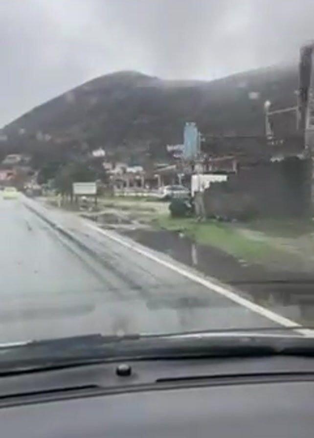 The video, taken from the interior of a car, shows a gray, wet, overcast day in a mountainous region