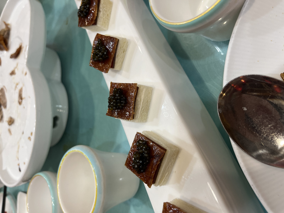 The image displays an indoor dining scene at a table in Dongcheng District, China. A prominent white ceramic rectangular serving dish centrally presents five individual appetizers. Each appetizer consists of a small, square piece of white bread, topped with a thin, glossy brown layer, and then crowned with a small cluster of black caviar. In the background, a large, white, multi-lobed ceramic bowl contains remnants of a previous course, appearing as pieces of meat or mushrooms in a light-colored liquid. Two small, white ceramic cups, each with a light blue exterior band and a thin yellow rim, are visible in the mid-ground and background to the left. A metallic spoon rests in a partially visible white bowl in the lower foreground. The table surface beneath these items is a consistent light turquoise color. No people are visible.