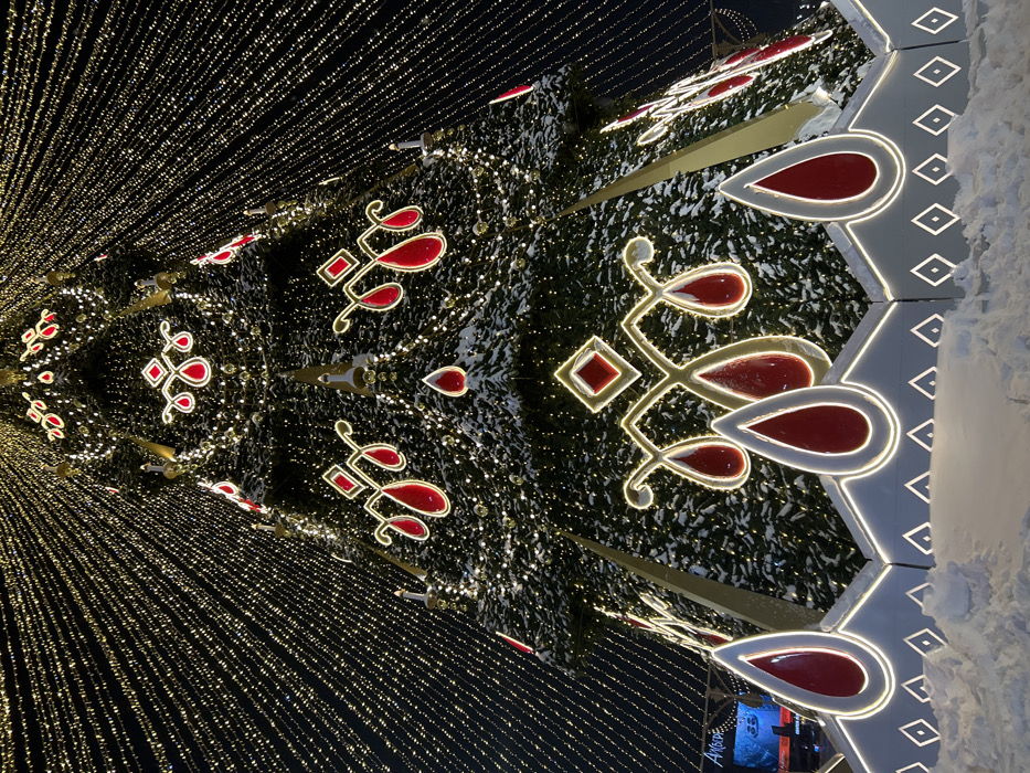 An angled perspective reveals an illuminated tunnel. Strings of lights converge into the distance, meeting an elaborately decorated Christmas tree. The tree features large, illuminated ornaments with teardrop and diamond shapes in white and red. Snow coats the branches. The tunnel's entrance is outlined by geometric white patterns with red accents. Patches of snow are visible at the base.