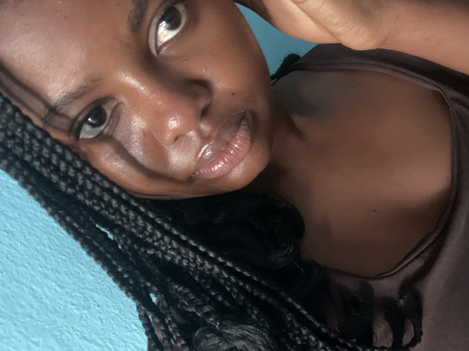 A close-up shot captures a woman with dark skin and braided hair. Her face is angled towards the camera, with shiny lips and expressive eyes. A hand is near her face, possibly touching her head. She's wearing a brown top, and a turquoise surface is visible in the background. The lighting creates highlights and shadows on her skin, emphasizing its texture.