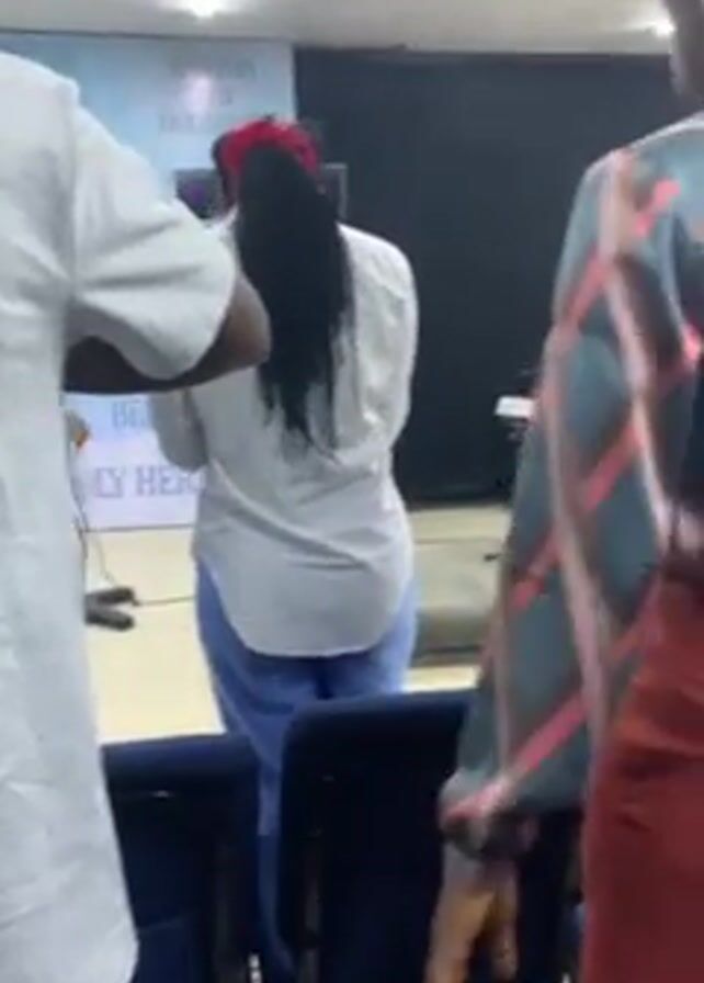 n interior scene where a woman is standing facing a banner that reads "Inspired by the Holy Ghost"