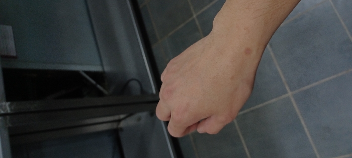 An indoor shot displays a person's hand and wrist resting on the edge of a stainless-steel object. The arm extends out of frame. The hand is fair-skinned and unmarked, save for a small, light-brown mole near the wrist. The background consists of blue-grey tiled floor. The stainless-steel object has several shelves or levels, though the contents on them are not visible.