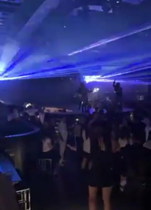 nightclub setting with many people dancing under bright blue laser lights. The club has a modern design with a dark interior. People are dressed in various outfits, mostly dark colored. They are moving and dancing to music, their silhouettes visible against the light. The laser lights create patterns across the ceiling and the crowd, adding to the energetic atmosphere of the club.