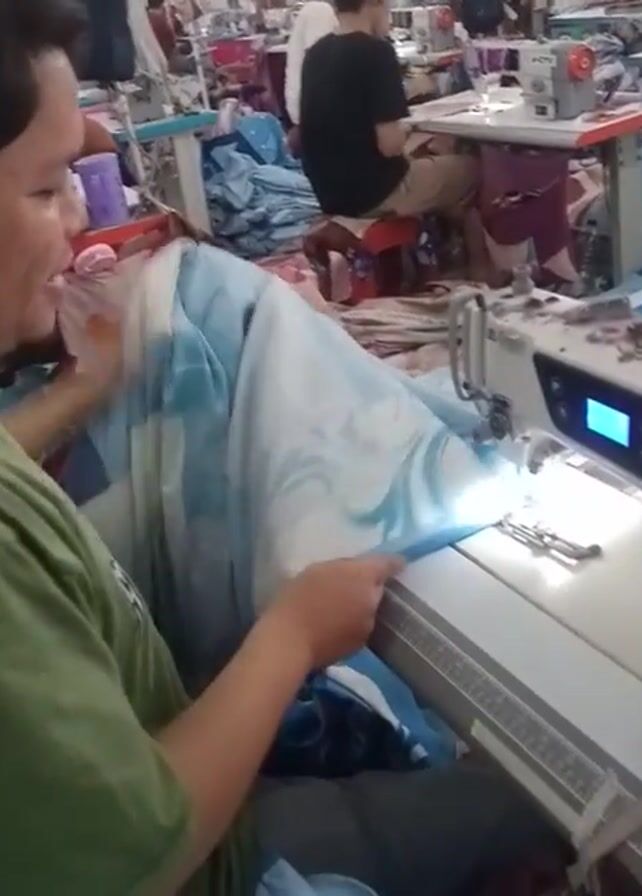 A person in a green shirt is seated at a sewing machine, stitching together two pieces of light blue fabric with a white wave pattern. The sewing machine is white with a blue digital display. The background is cluttered with various fabrics in different colors and patterns. Another person wearing a black shirt and beige pants is seen in the background. The camera is oriented overhead, looking down at the scene.