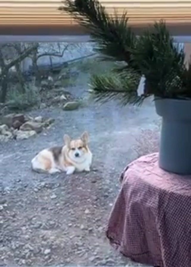 Through a window, a corgi dog is lying on a gravel surface outdoors. Indoors, next to the window, is a potted evergreen branch on a table covered with a checkered cloth. The window has horizontal blinds. The outdoors appears to be a yard with rocks and trees.