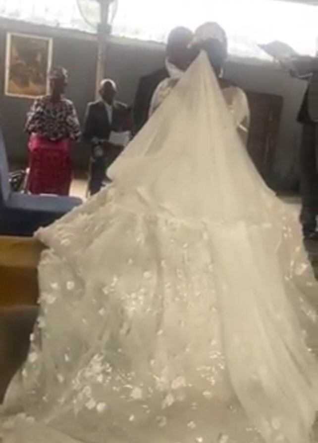 wedding ceremony taking place under a metal roof structure. The bride stands with her back to the camera, wearing a large, white, floral-patterned wedding gown with a long veil. A groom stands beside her, and an officiant reads from a paper in front of them. Two older individuals stand in the background to the left. A young boy is standing between the two older individuals. A large fan rotates overhead. Speakers are situated behind the officiant. The video is shot from a low angle.