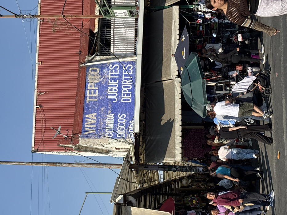 A crowded marketplace scene is depicted with vendors and shoppers visible. A blue sign reading "Viva Tepito, Comida, Discos, Juguetes, Deportes" hangs on the side of a building with a corrugated red roof. Awnings and umbrellas provide shade over the various stalls, displaying items for sale. People are closely packed, walking and browsing. The image suggests a bustling, lively atmosphere.