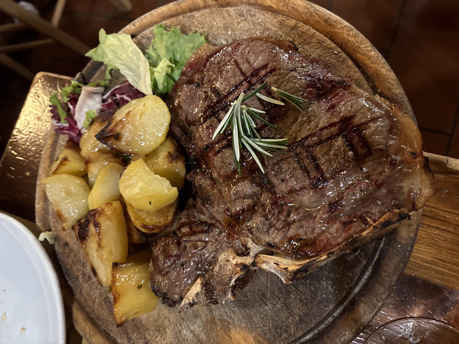 The image displays a large, grilled T-bone steak, exhibiting visible char marks and grill lines, served on a circular rustic wooden board. Two sprigs of fresh rosemary are placed on top of the steak. Adjacent to the steak, in the upper right portion of the board, is a pile of golden-brown roasted potato chunks. A small portion of mixed green salad, consisting of green lettuce leaves and red radicchio, is positioned next to the potatoes and steak. The wooden serving board rests on a light-colored wooden table. A white ceramic plate is partially visible and out of focus in the upper left background, and a clear glass is partially visible in the lower left foreground. The scene depicts a meal in an indoor restaurant setting in Florence, Italy. No individuals are visible.