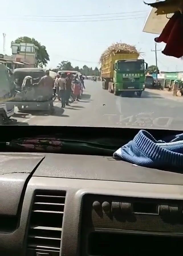 The video, taken from inside the cab of a vehicle, shows a busy street scene in what appears to be a rural or semi-rural area