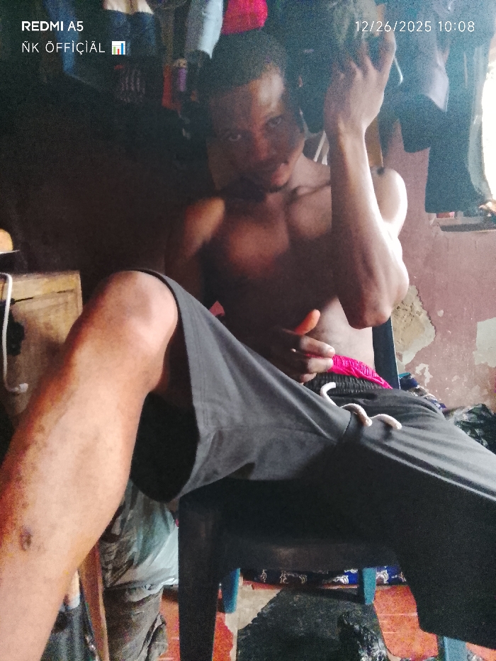 A shirtless man sits on a chair, wearing black shorts with a pink waistband and white drawstrings. The setting appears to be indoors with clothes hanging in the background. The photo was captured by a Redmi A5, indicated at the top left, with the timestamp showing December 26, 2025, at 10:08. The man holds a phone in his hand.