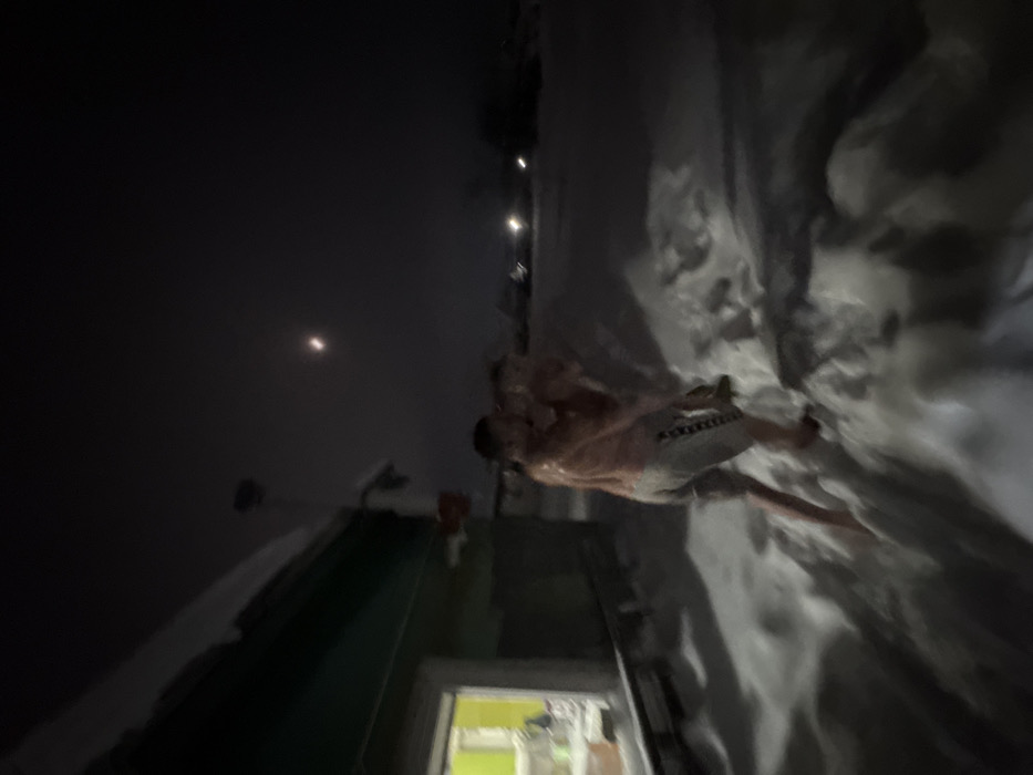 A shirtless man is seen walking on a snowy surface at night. The sky is dark with a faint light source. The man wears shorts and appears to be emerging from a brightly lit doorway or building. The background is dominated by snow, potentially a snowdrift or accumulation. The scene has a somewhat blurry, handheld camera aesthetic.